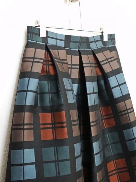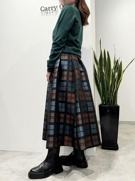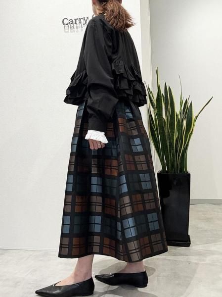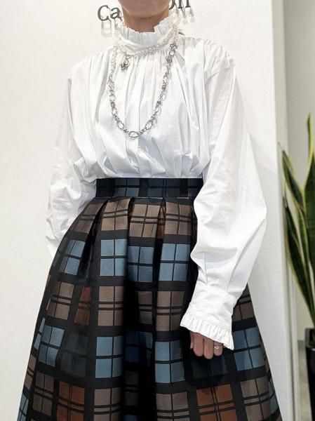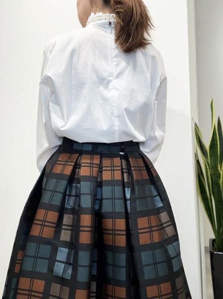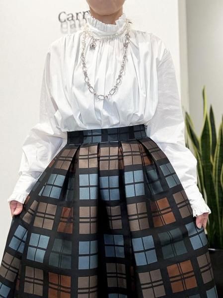 ウエストからタックを入れることで、かなりフワッとしたシルエットになる。低彩度カラーのチェックなので、甘くなりすぎず落ち着いた印象に。上品でエレガントな中にも個性を放つ存在感抜群の一枚。