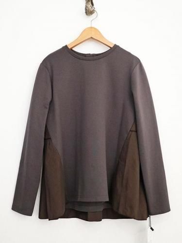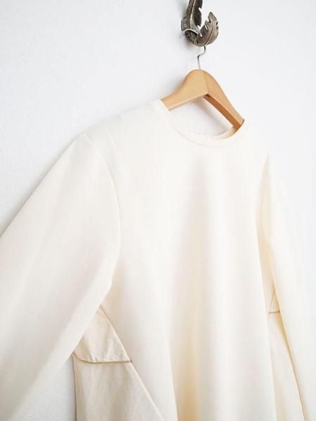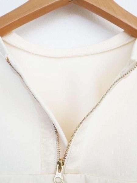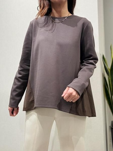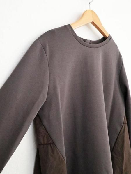 後ろ姿を彩るメローフリルで女性らしさを演出します。異素材の組み合わせと上質な素材使いで個性的に見せ、体のラインを拾わず大人にこそ似合う抜け感がポイント。ファスナー部分のグログランテープがアクセントになります。シャカシャカしたスポーティー素材とのドッキング。コットン混でしっとりとした滑らかな着心地が特徴です。