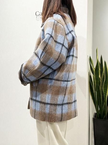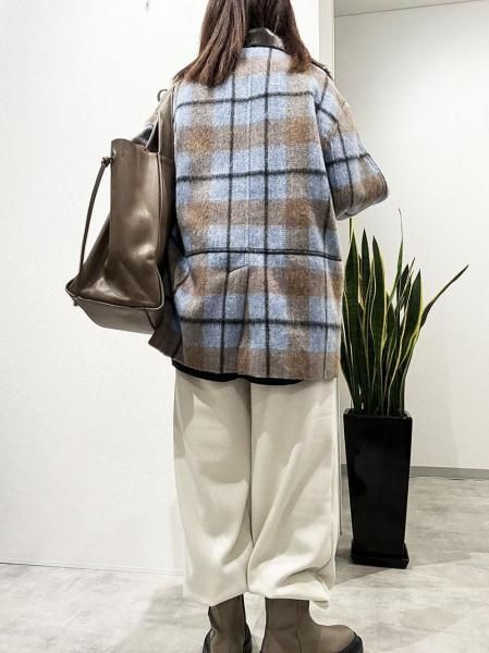 ベージュとブルーのミックスチェックがお洒落なふわほわなシャギーウール混素材のメンズライクなカバーオールデザインコート。少し尖りめなレザー襟が印象的でお洒落!取り外すとクルーネックでがらっと印象が変わり上品に!ボタンは第一のみ表に見え、他は比翼仕立てですっきり。着丈もしっかりあるので、保温性も可愛さも兼ね備えた一着。見た目も価格も可愛いいながら、かなりお値段以上の仕上がりで驚き!