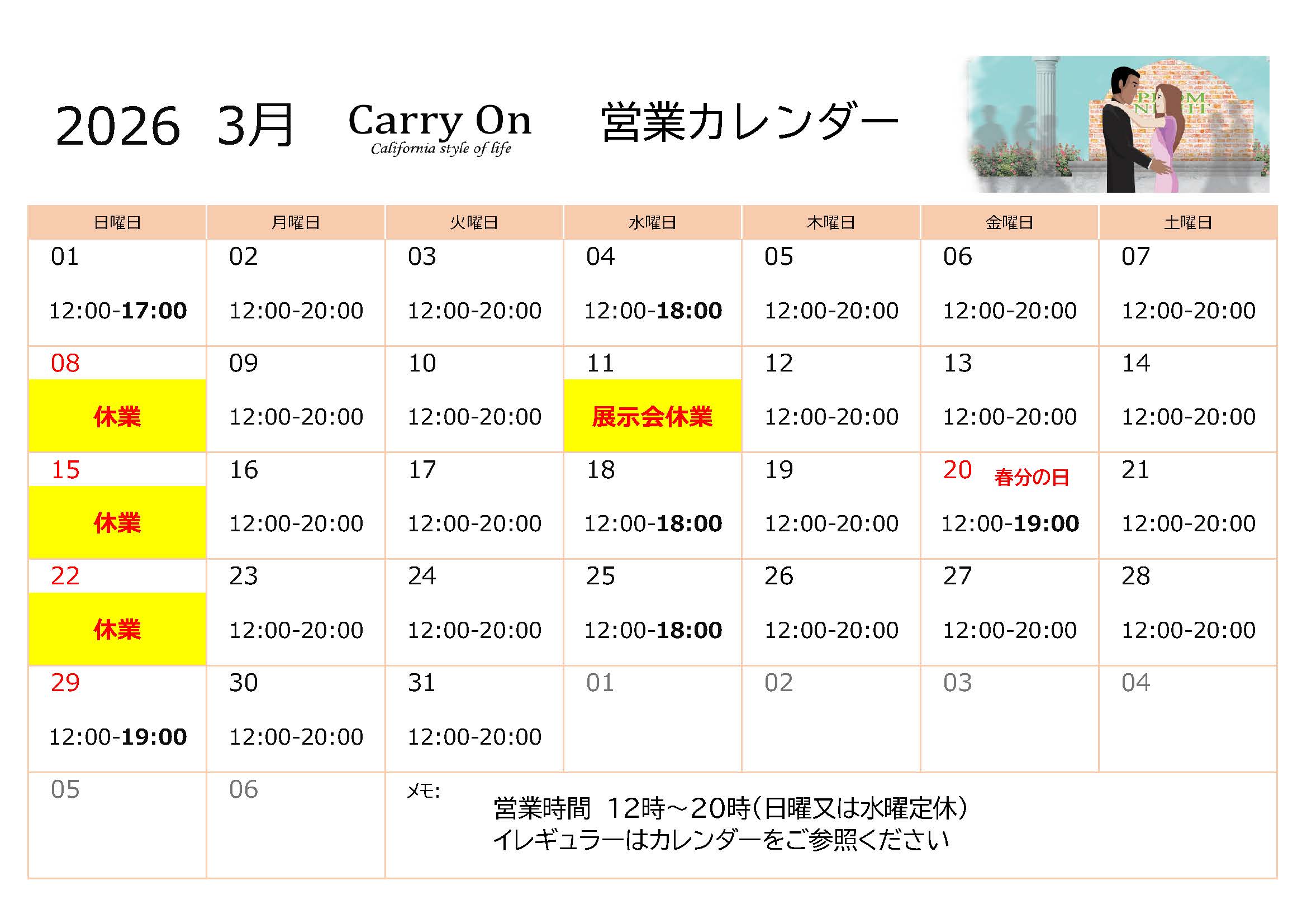 3月のCarry On店舗営業スケジュールです。