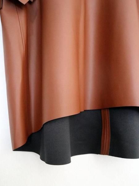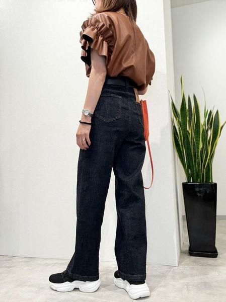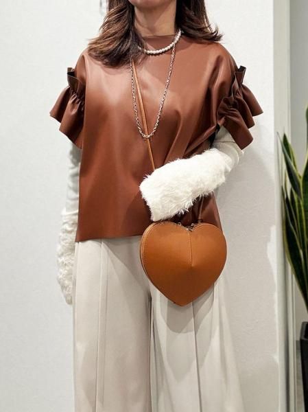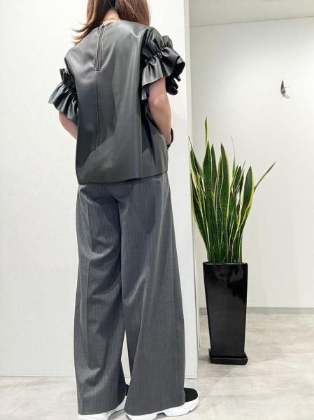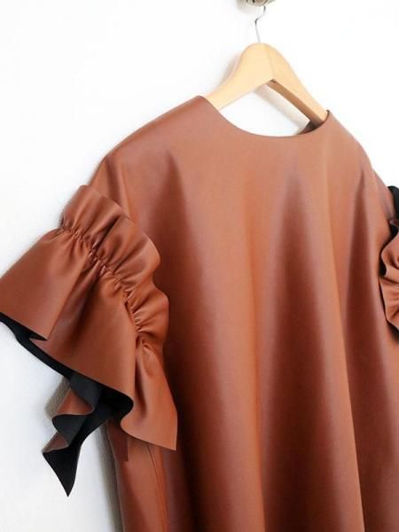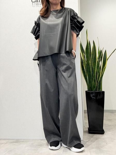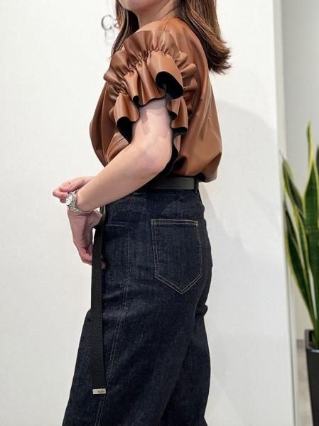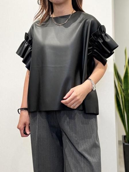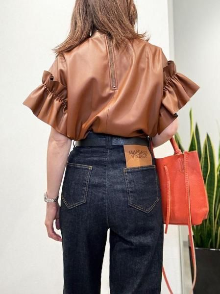 レザーのエッジと、袖口のボリュームフリルの甘辛バランスが絶妙な一枚で着映えするトップスです。バックネックのファスナーが大きく開くので脱着もスムーズ。柔らかいエコレザーを断ち切り仕様で仕上げているので、思いのほか、すっきり!ボトムINの着こなしも可能です。デニムとの相性200%!季節が進んだらインナーにハイネックの長袖トップスやニットをレイヤードしてもOK!