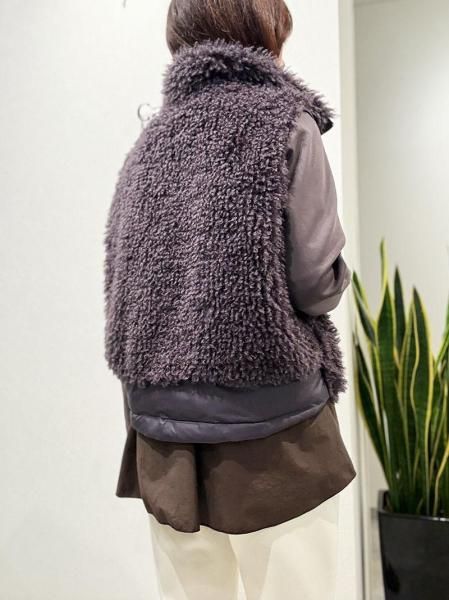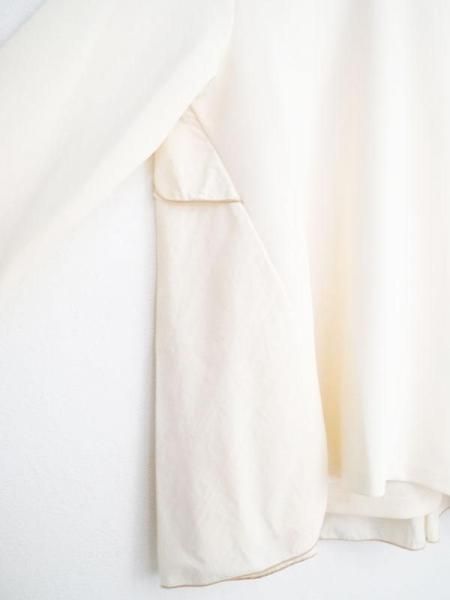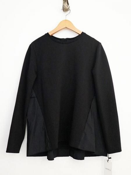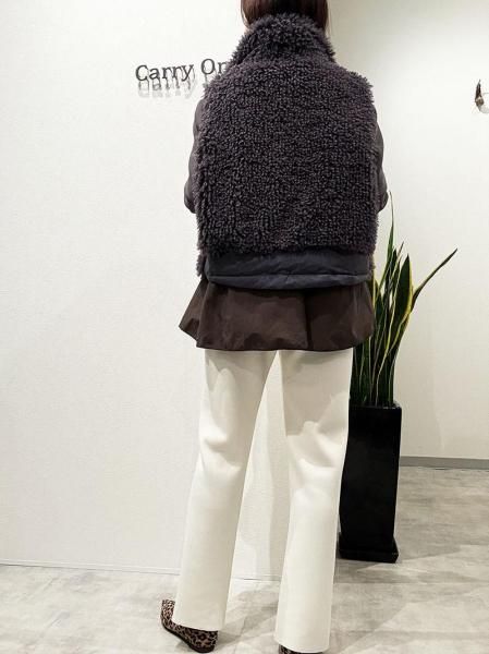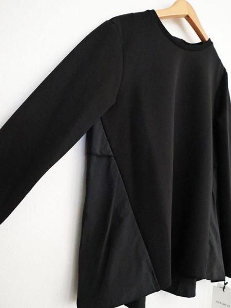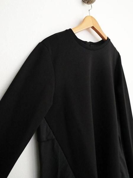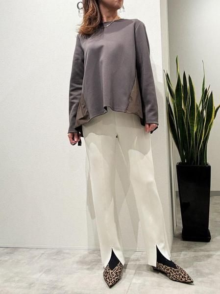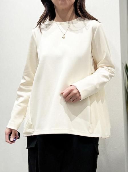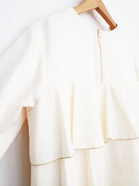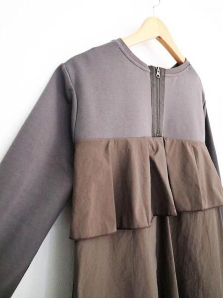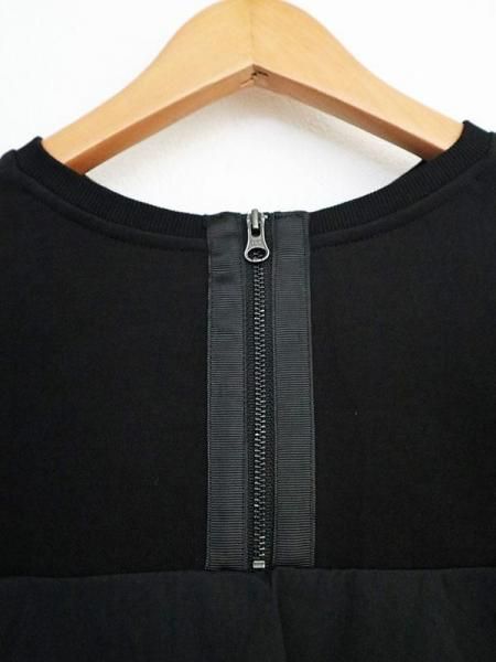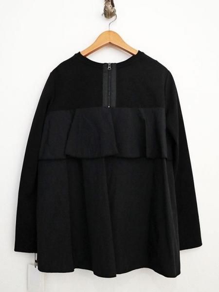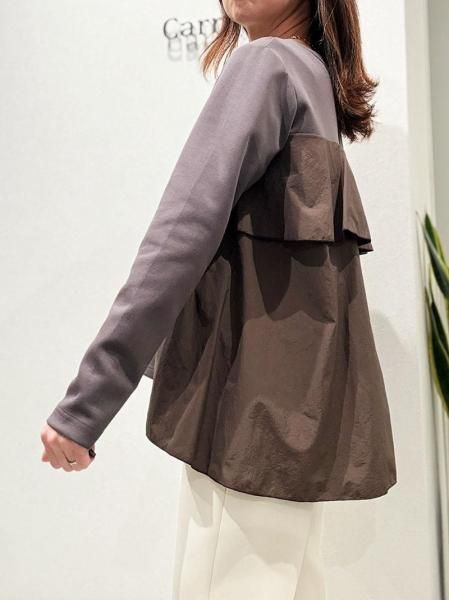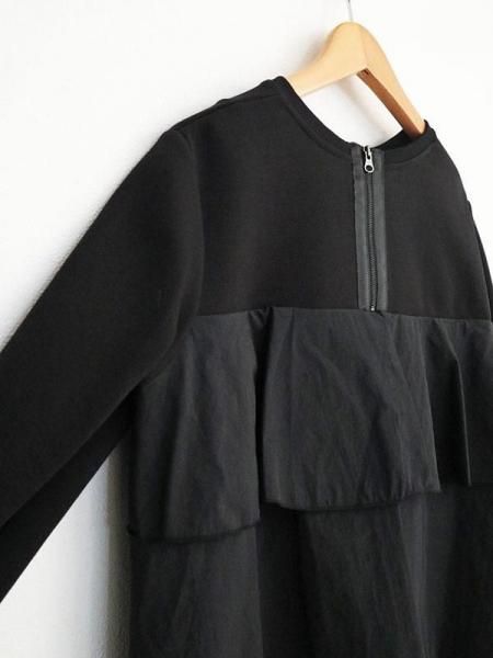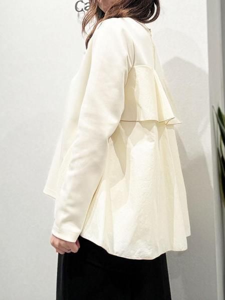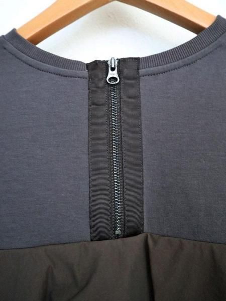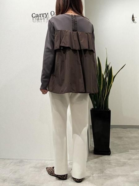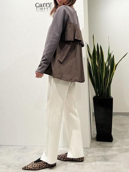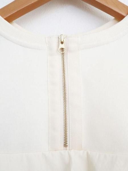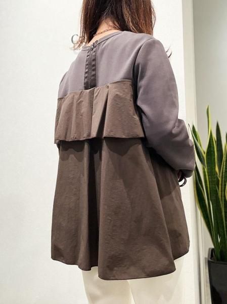 後ろ姿を彩るメローフリルで女性らしさを演出します。異素材の組み合わせと上質な素材使いで個性的に見せ、体のラインを拾わず大人にこそ似合う抜け感がポイント。ファスナー部分のグログランテープがアクセントになります。シャカシャカしたスポーティー素材とのドッキング。コットン混でしっとりとした滑らかな着心地が特徴です。