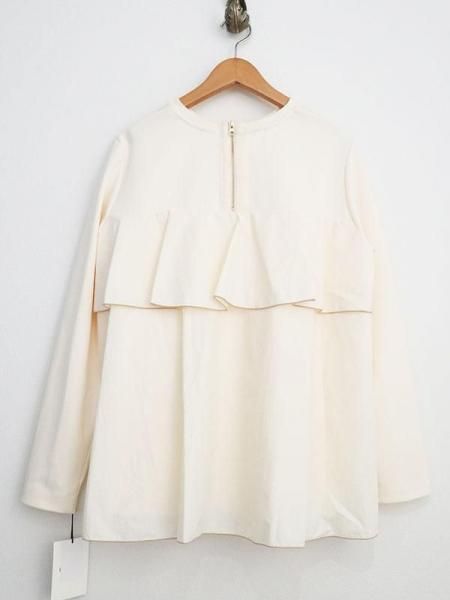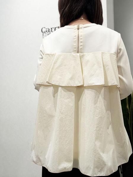 バックスタイルで魅せるメローフリルが可愛いブラウス感覚で一枚で着映えするデザイントップス。