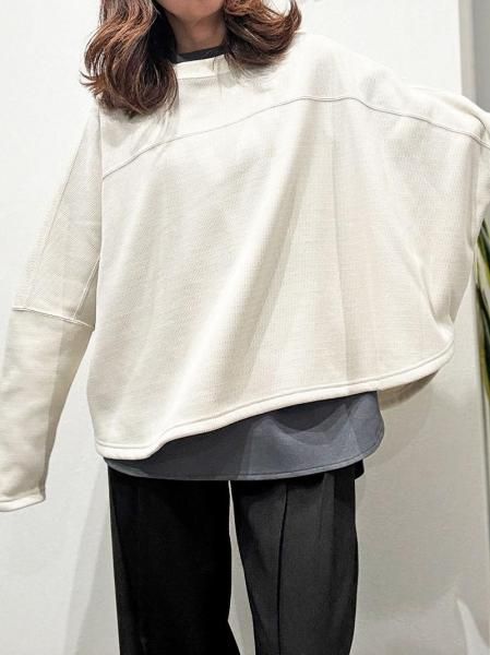 ワイドな身幅でバストから袖にかけて切り替えを入れたデザインがさり気なくスタイリッシュに決まる一枚です。裾はリブ無しなのですっきりと、カジュアルダウンしすぎない大人カジュアルな仕上がりです。ボトム選ばずコーデ幅広いヘビロテ間違いなしな一着です。